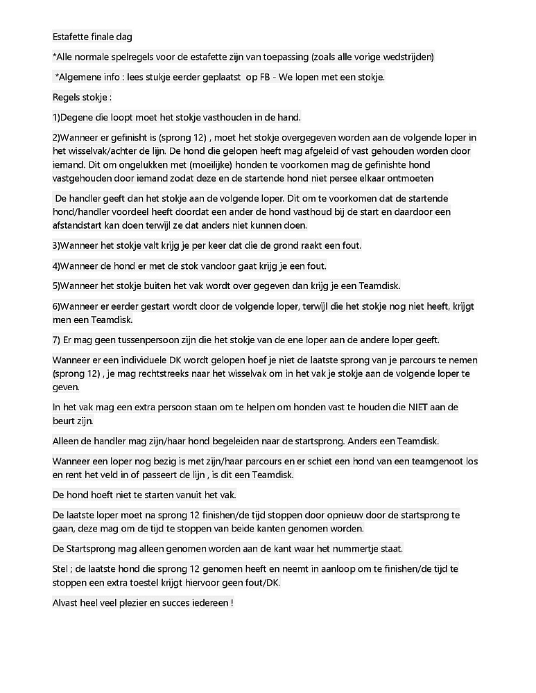 Spelregels 10/3 Houd ook Facebook in de gaten: Facebook.Aanvulling op de regels:Je mag als handler ook eerst de hond aanlijnen en dan het stokje overgeven , je kunt dan de hond met lijn even afgeven aan een ander. Dit is wat meer rustgevend.